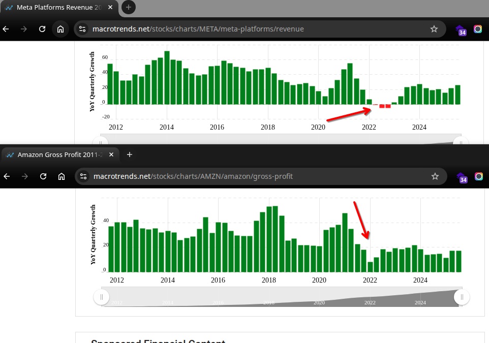And if the 2022-2023 layoff rounds seem surprising, they shouldn’t. A simple look into corporate performance clearly defines what is happening - here are Meta and Amazon as two examples: