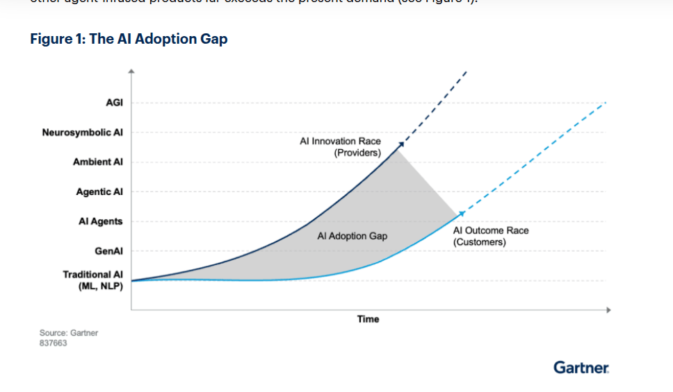 Gartner is talking about the AI adoption gap between innovation from AI providers and companies, but it’s equally valid for companies adopting AI vs. people on the market using legacy 2020 playbooks and tech:
